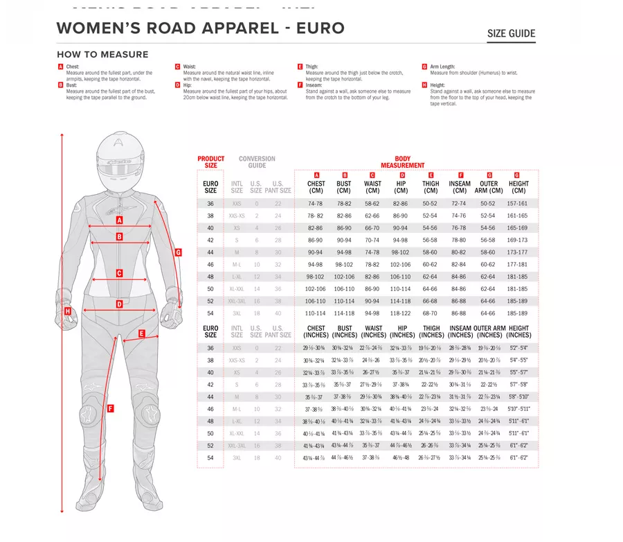 Euro 38 39 40.5 42 43 44.5 45.5 47 48 49.5 51 52 US 5 6 7 8 9 10 11 12 13 14 15 16 Rozmiary odzieży damskiej ALPINESTARS