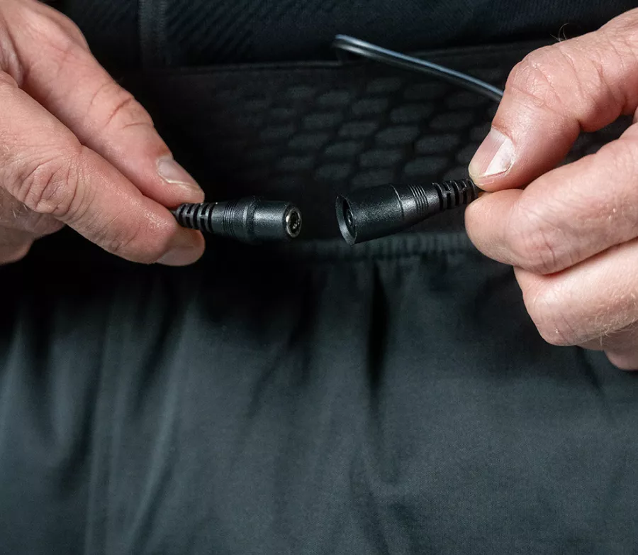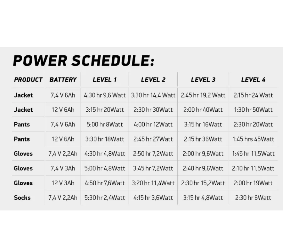 Do tego typu odzieży zalecamy akumulator 6 A, najlepiej 12 V. Alternatywnie, akumulator 7,4 V – 6 A lub bezpośrednie podłączenie do motocykla zapewniają nieograniczony zapas energii (zwykle 12 V).