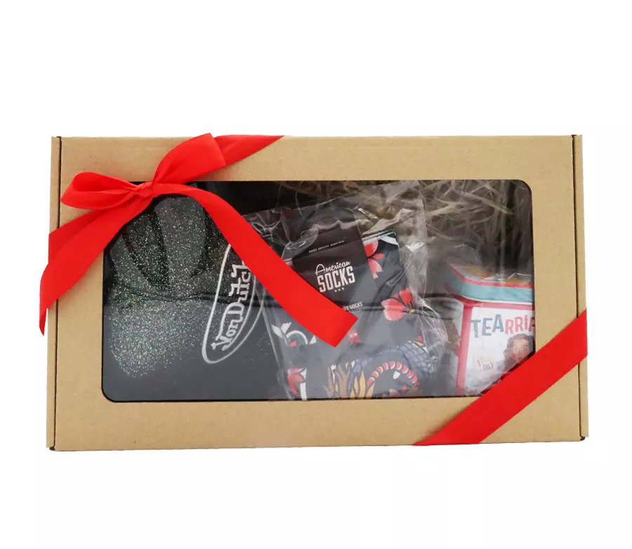 Mamy dla Ciebie idealne rozwiązanie – wyjątkowy pakiet pełen stylowych prezentów! Wszystko jest pięknie zapakowane w pudełko prezentowe, gotowe do wręczenia Twojej drugiej połówce. W pakiecie znajdziesz: Kolczyki Louis SKULL Czajnik Tearrific! American Socks Eternal Naszywka Rusty Pistons Czapka damska Von Dutch Trucker Glitter w kolorze czarnym